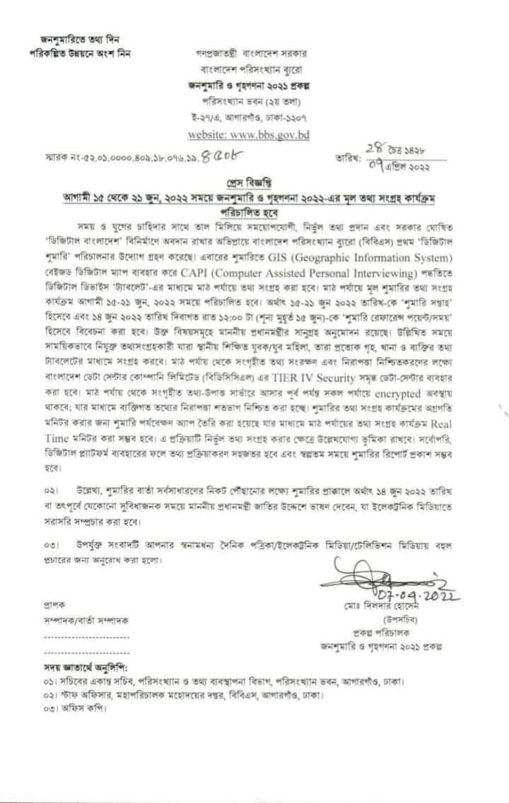 আগামী ১৫ থেকে ২১ জুন, ২০২২ সময়ে জনশুমারি ও গৃহগণনা ২০২২-এর মূল তথ্য সংগ্রহ কার্যক্রম পরিচালিত হবে।